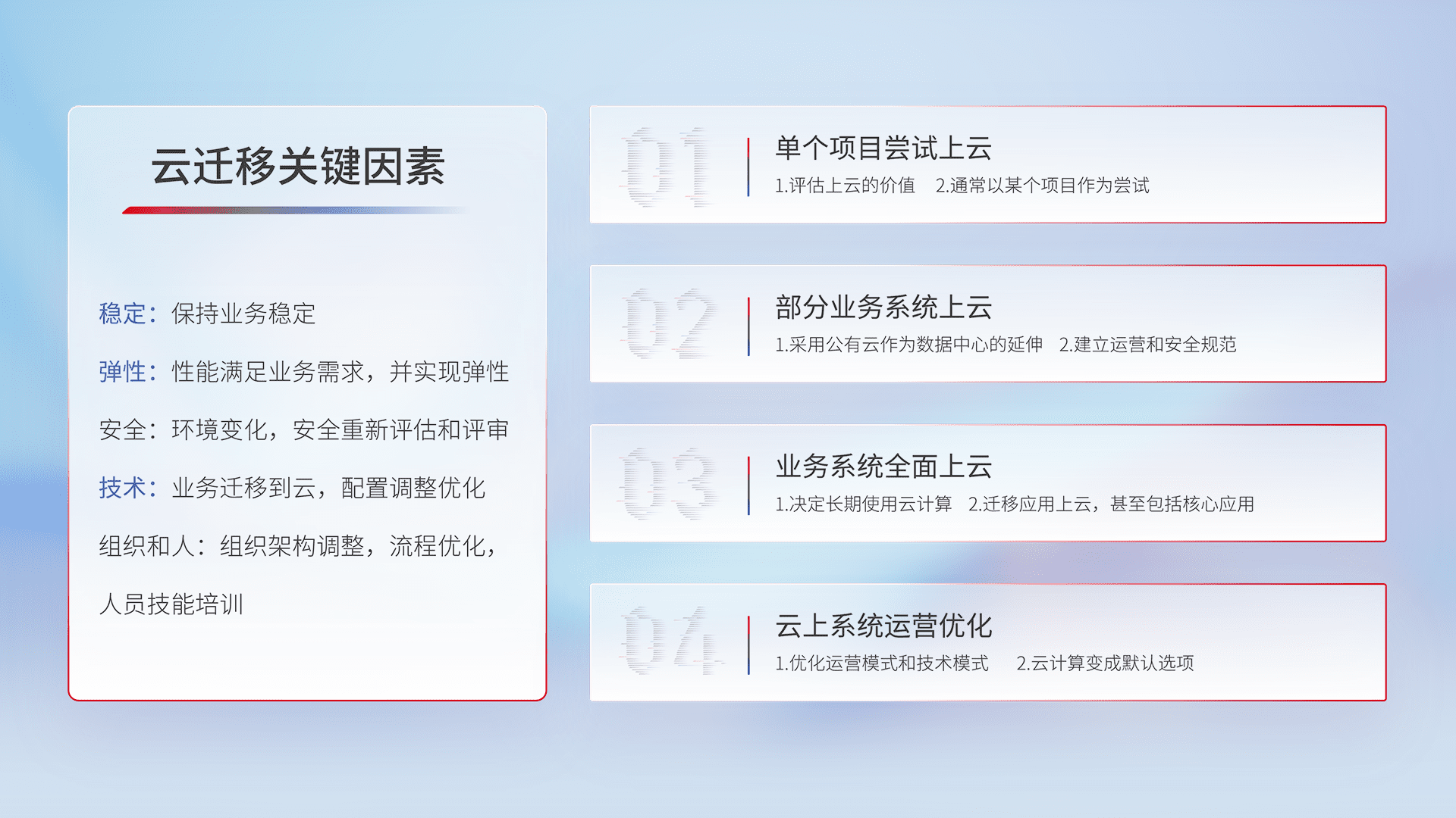 结合实际业务,,,,从规划设计、、云平台选型、、、、云原生改造、、、数据迁移、、、集成交付,,迁移全过程为客户识别最佳上云路径,,做好风险识别管理,,,,设计网络架构、、身份权限、、、安全审计合规、、、、操作审计、、、日志审计、、监控告警策略、、、多站点容灾设计等,,,,对云上基础设施进行整体规划,,,提升IT治理水平,,以满足弹性、、高可用、、、高性能的需求。。。。