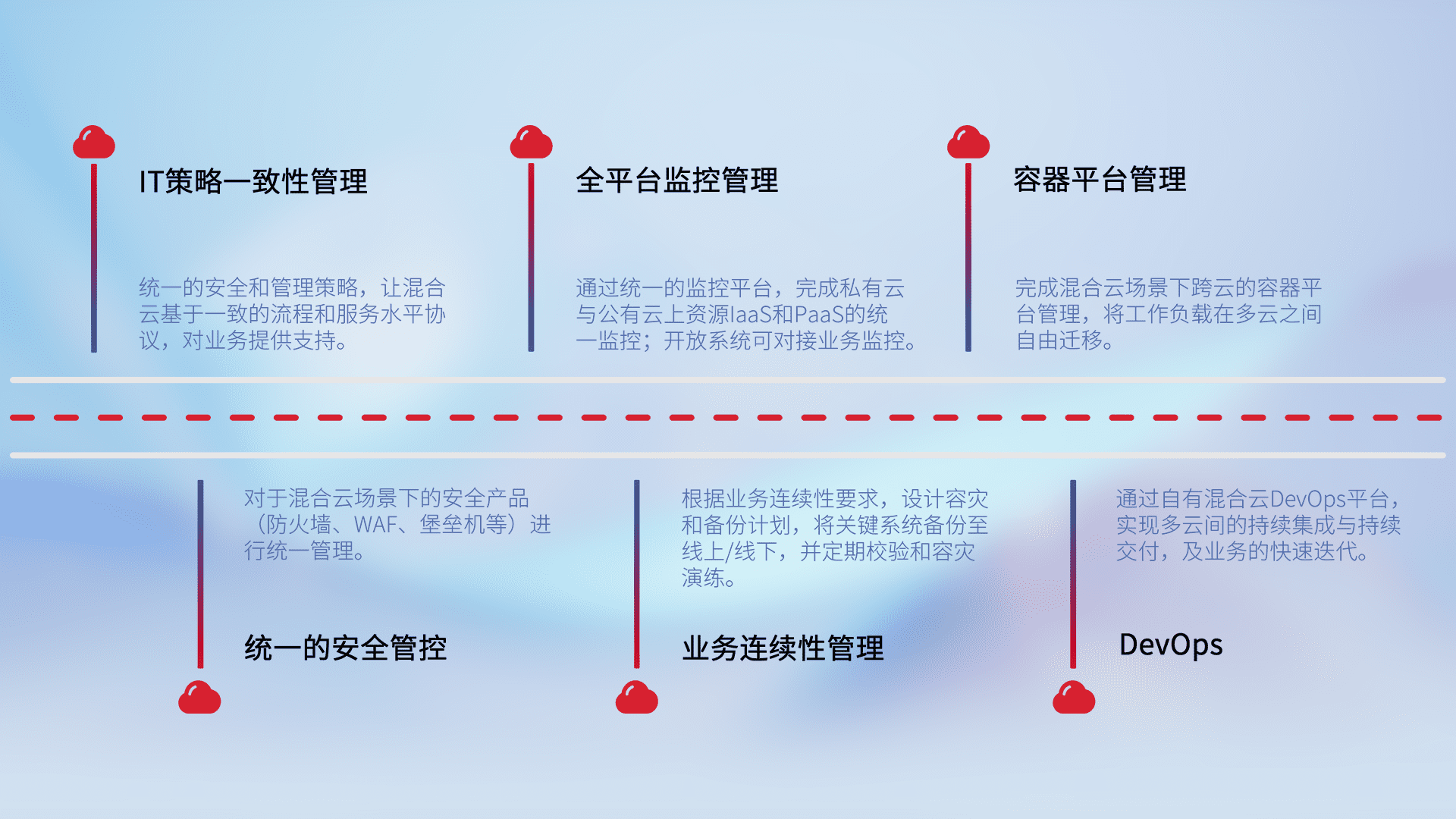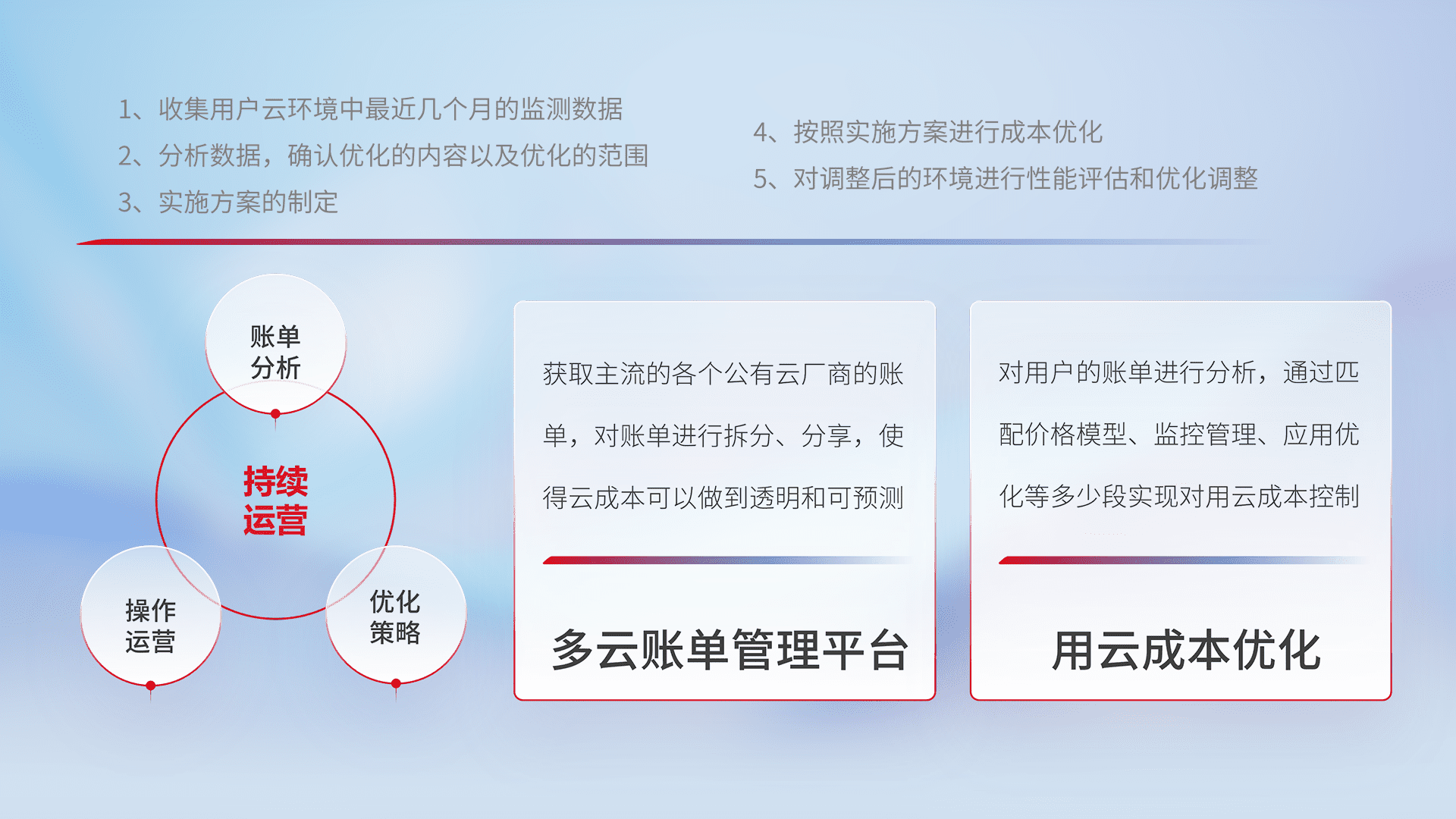 通过多云纳管,,,以统一的资源数据模型把客户的云资源进行抽象和封装,,,进而实现对多云资源的统一操作,,,保障云资源管理的可靠性、、稳定性与可用性。。。量身定制化运维内容,,,,配置、、开发运维、、补丁管理、、、备份、、监控、、、、认证和访问管理、、、、审计和日常巡检等,,,,保障在用云过程中的可靠度,,,稳定度以及高可用率。。。